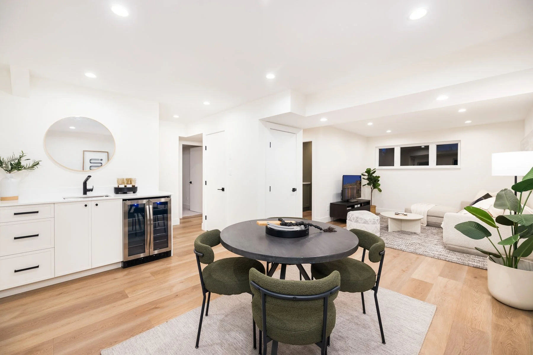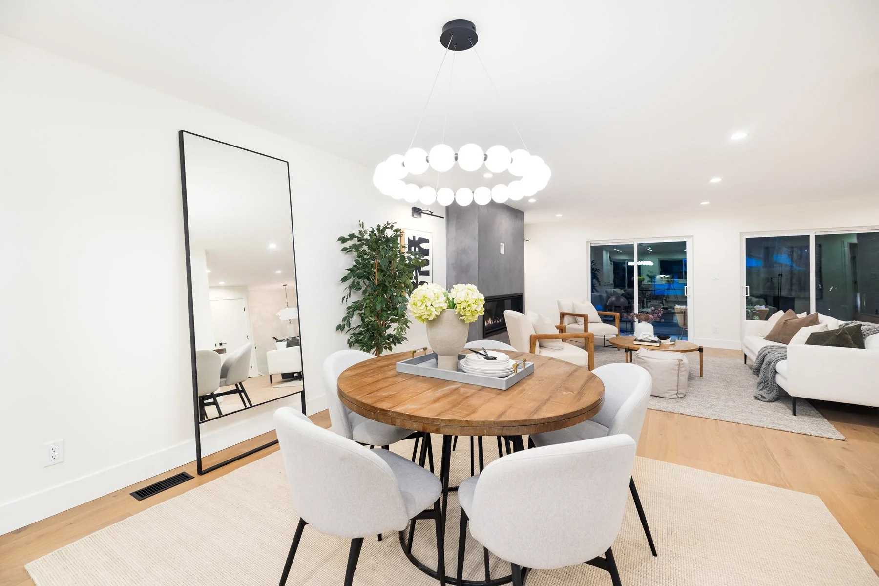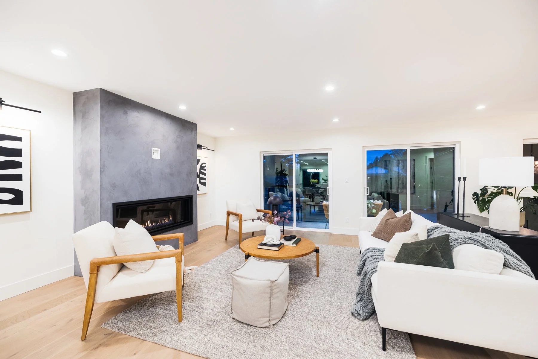 This reimagined renovation features an open-plan kitchen, dining, and living room, thoughtfully arranged for effortless flow and everyday comfort. Large sliding doors and expansive windows invite abundant natural light into the space, creating a bright, airy atmosphere. Beautiful hardwood flooring runs throughout, unifying the rooms with warmth and timeless character.